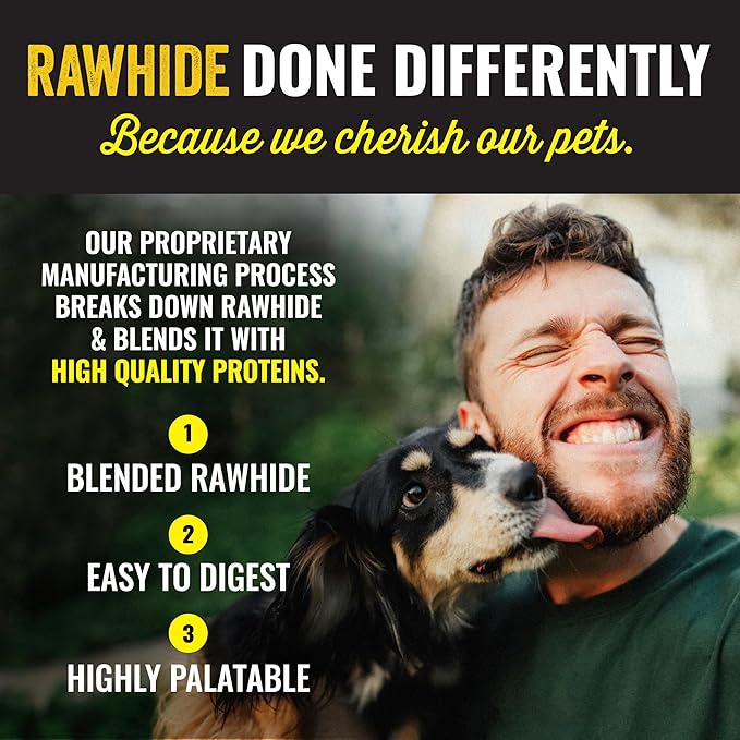 • Blended Rawhide – Our proprietary manufacturing process breaks down rawhide and blends it with protein.