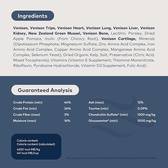 - HIGH PROTEIN, NUTRIENT DENSE: Featuring free-range Venison Deer, Organs, Bone, and New Zealand Green Mussels, this grain-free dog food delivers nutrition with a mouth-watering taste for all dogs. Gentle air dried processing retains the goodness of the raw ingredients. This food offers stimulating crunchy texture small enough for puppy food but soft enough for senior dog food.