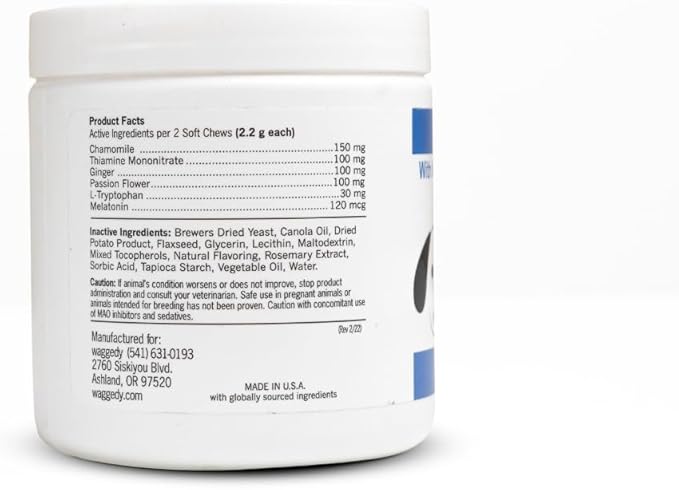 - Natural Calm Aid: waggedy’s calming dog soft chews are proven effective at relieving hyperactive and aggressive behaviors in dogs. Formulated with melatonin, L-Tryptophan, chamomile flowers, passion flower, and ginger, our calming dog chews support the nervous system to help reduce anxiety, especially in a stressful environment