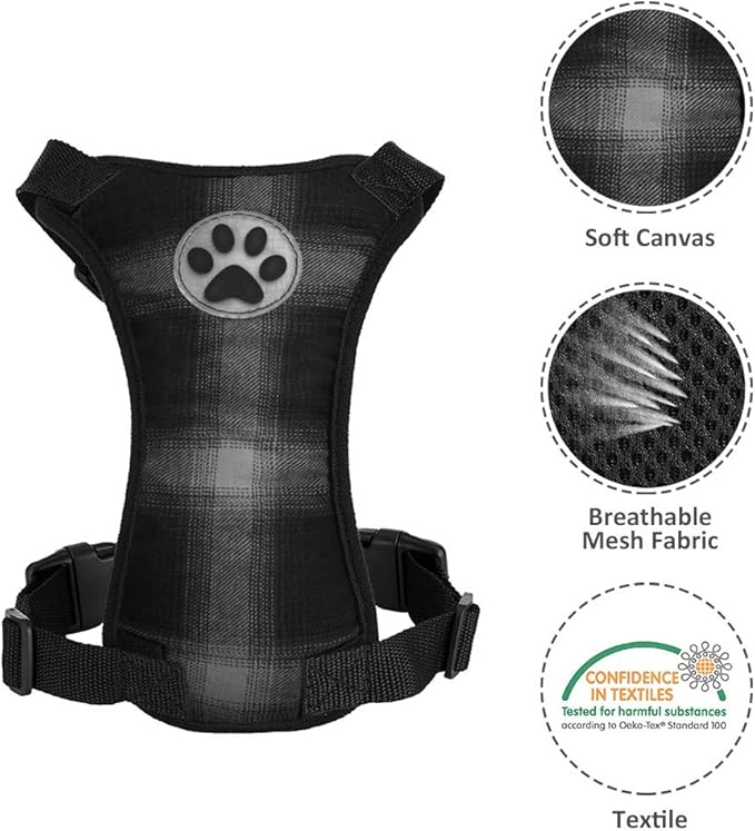 - Suitable and Humanized Design --- Breathable Canvas Chest Harness would relieve the pressure. It is adjustable depending on how much lead way you need to plug into your cars seatbelt it fit perfect definitely. The included seat belt was long enough to let him move in the back seat and lay down.