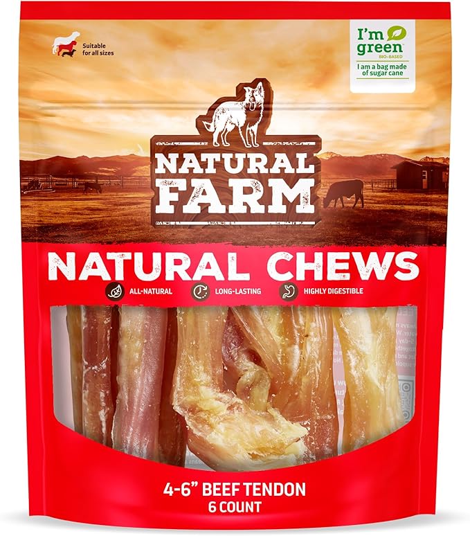 Natural Farm Extra-Thick Beef Tendons (4-6 Inch, 6 Pack), Natural Chondroitin and Collagen: Supports Healthy Joints, Great for Dental Health – Made & Packaged, All Dog Sizes