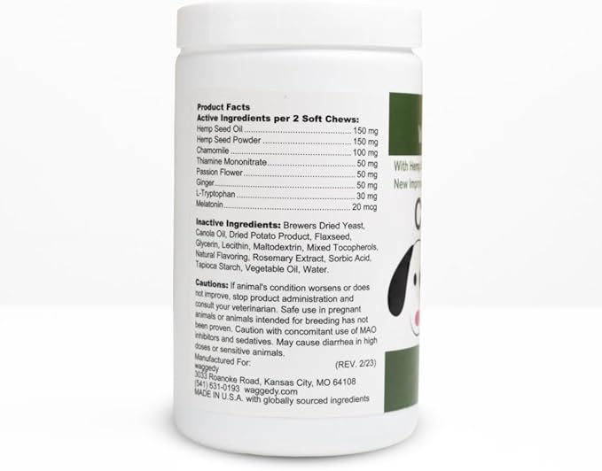 - Natural Calm Aid: waggedy’s calming dog soft chews are proven effective at relieving hyperactive and aggressive behaviors in dogs. Formulated with melatonin, L-Tryptophan, chamomile flowers, passion flower, ginger, and botanical seed blend, our calming dog chews support the nervous system to help reduce anxiety, especially in a stressful environment