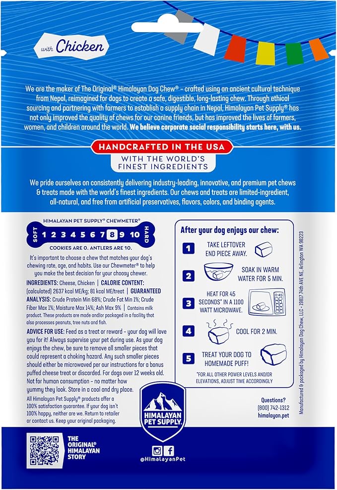 - CHICKEN FLAVOR: Included is 3 small chicken flavored Himalayan yak cheese sticks (1.1 oz each) - made using our traditional Himalayan cheese recipe, but with added bits of chicken for more flavor! Ideal for dogs 15 pounds and smaller, not for dogs younger than 12 weeks.