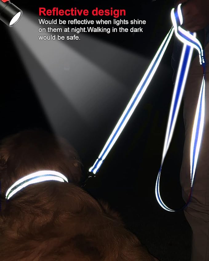 - DOUBLE-SIDED REFLECTIVE: Upgraded double-sided reflective leash features reflective stitching on both sides to improve its visibility and would be reflective when lights shine on it at night. Can keep your doggie safe during evening walks or runs