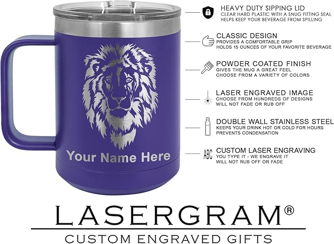 - The design and text won't fade away since we laser engrave it right onto the mug. Comes with a snug fitting lid to help prevent spills.