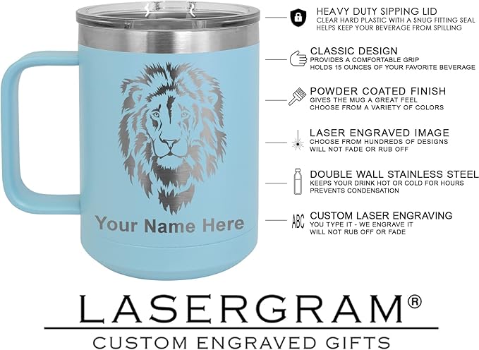 - The design and text won't fade away since we laser engrave it right onto the mug. Comes with a snug fitting lid to help prevent spills.