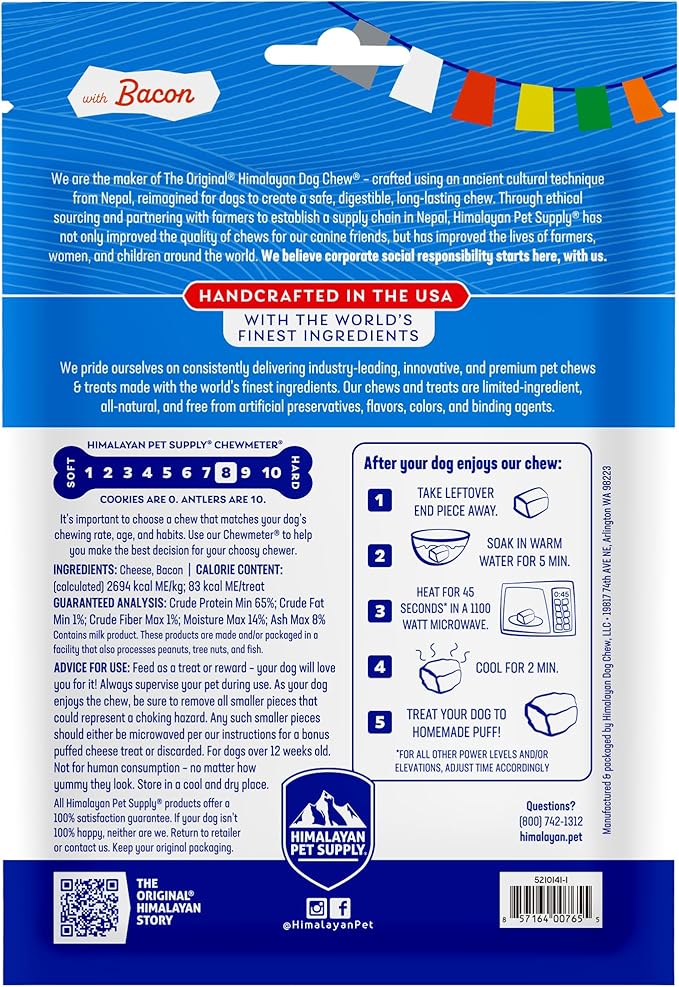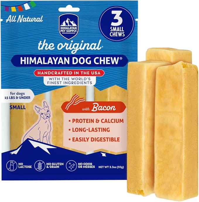 - Bacon Flavor: Included is 3 small bacon flavored Himalayan yak cheese sticks (1.1 oz each) - made using our traditional Himalayan cheese recipe, but with added bits of bacon for more flavor! Ideal for dogs 15 pounds and smaller, not for dogs younger than 12 weeks.