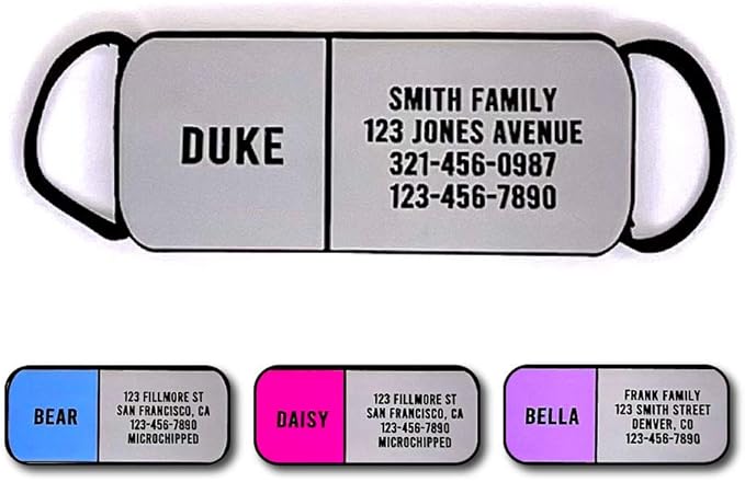- The tags are Non-Toxic, Eco-Friendly and Food Grade – The engraving is cut into the silicone Pet ID tag so it will not rub off - Easy to clean, deep engraved dog ID tag stays looking brand new Premium quality, superior design, quiet & safe - Metal tags are plain, noisy and the engraving rubs off.