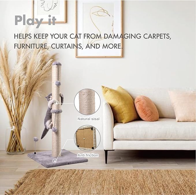 MECOOL 34“ Tall Cat Scratching Post Premium Basics Kitten Scratcher Sisal Scratch Posts Trees with Hanging Ball for Indoor Cats, Gray