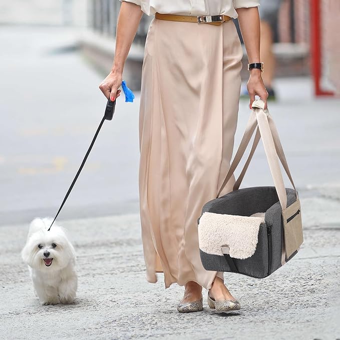- TWO in ONE DOG CAR SEAT - UPGRADED dog car seat, the dog booster seat design with comfortable shoulder strap for ease of carrying. Install the dog seat on console while driving, provide your pet a comfortable car trip. Carry the Console Car Seat with the shoulder strap, it is a dog carrier. Two newly designed independent storage pockets increase capacity without squeezing your dog during use. The smooth zippers offer better protection for your items.