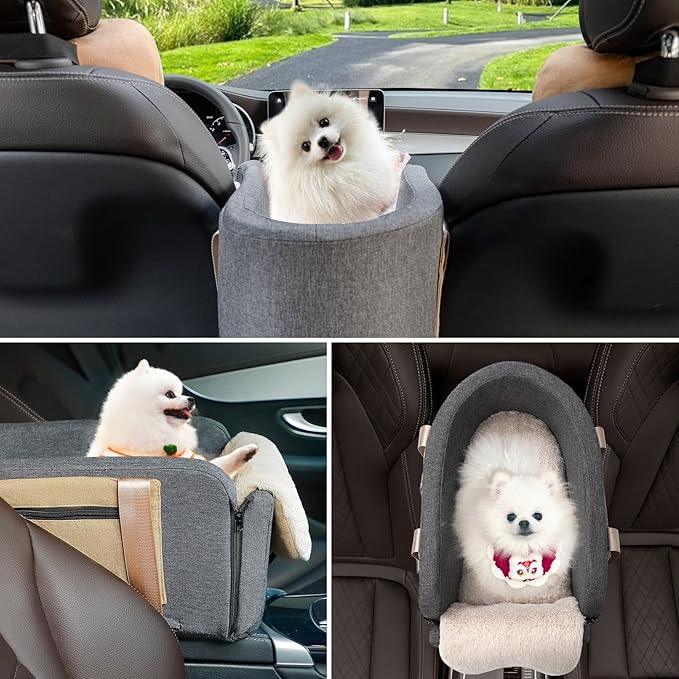 Console Dog Car Seat Cat Carrier - Pet Car Booster Seat on Cars' Armrest Travel Bags for Cats Dogs with Easy Carrying Strap Dog Travel Carrier with Safety Tethers