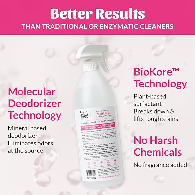 - Powerful Molecular Deodorizer- Skout's Honor Severe Mess Stain & Odor Remover targets and eliminates foul odor molecules on contact, ensuring your home stays fresh and clean.