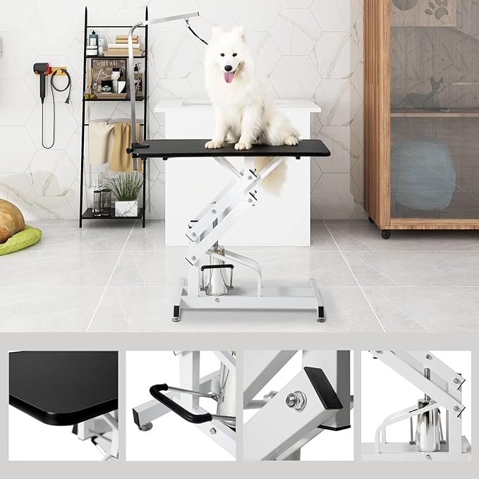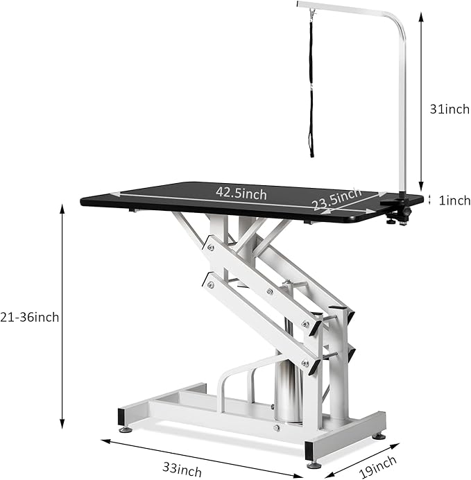 - 【Adjustable Grooming Table】Hydraulic, Foot-Activated Lift Mechanism Allows Easy.Lift range from 21" to 36".