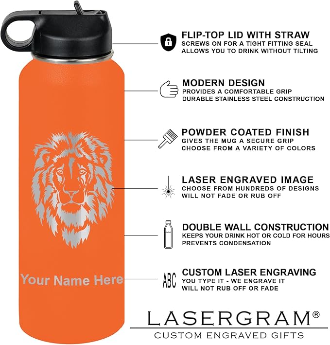LaserGram Personalized Water Bottle, Dragon, Stainless Steel Double Wall Vacuum Insulated with Flip Top Straw, Custom Engraved Gift (40oz / 1180ml Orange)