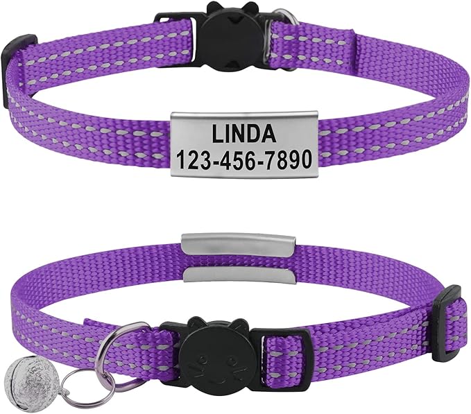 - Your cat’s Identification is long lasting engraved into metal tag on the collar. Your phone number and cat’s name will stand out on the reflective collar, it helps others to contact you when your cat get lost.The metal tag and collar bell can be removed if you want.