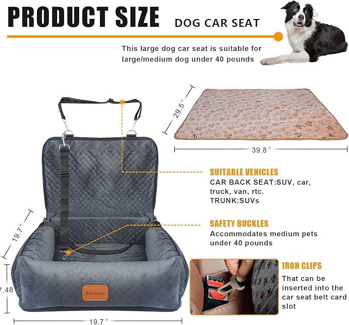 - Pet car seat size:19.7"(L)X19.7"(W)X7.9"(H),suitable for small and medium-sized pets up to 40 pounds;suitable for all types of cars,it can not only be installed in the front seat of the car,but also can be installed in the back seat to use.