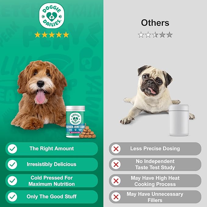 - Trusted by Pet Parents Everywhere: Doggie Dailies has helped nearly 1M dogs stay active and happy, with over 75% of customers coming back for more; Our dog arthritis supplement is a favorite among senior dog supplements.