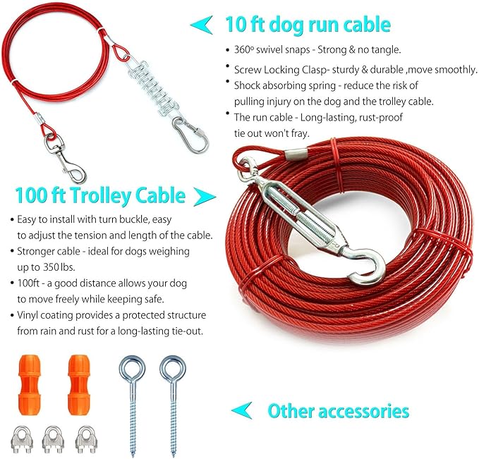 - ❤ WHAT’S INCLUDED IN THE PACKAGE? Contains a 100 ft aerial trolley cable, a 10ft dog run cable, a 10ft side cable, 2 stoppers, 3 clamps, 2 screw locking clasps, an installation instructions.
