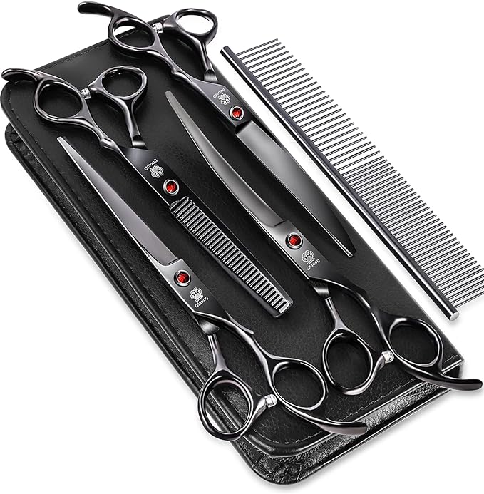 - ★Professional Pet Grooming Scissors Kit★-The kit includes 1 × 7.3-inch thinning shear, 2 × 7.7-inch curved scissor, 1 × 7.7-inch straight scissor, 1 × pet comb, 1 × cleaning cloth, 1 × black leather case