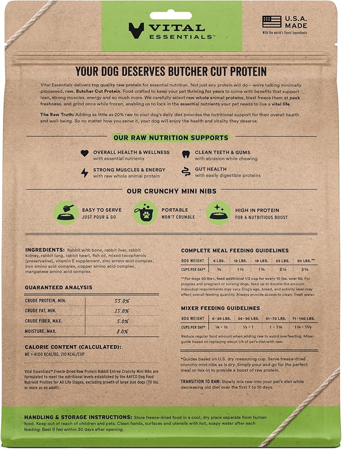 - CRUNCHY FREEZE-DRIED RAW RABBIT DOG FOOD: Vital Essentials Crunchy Freeze Dried Dog Food packs more protein than industry standard into every bite to deliver the peak vitality your dog deserves, especially when compared to dehydrated dog food. This complete and balanced freeze-dried raw dog food is made with premium butcher cut rabbit, responsibly sourced in the EU.