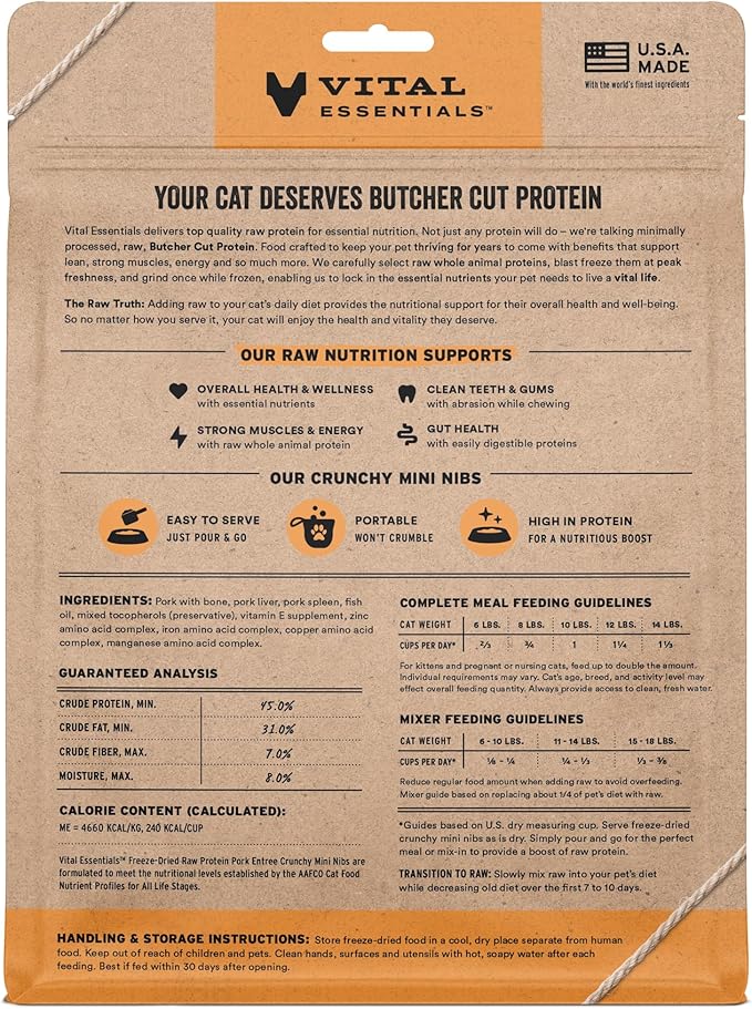 - CRUNCHY FREEZE-DRIED RAW PORK CAT FOOD: Vital Essentials Crunchy Freeze Dried Cat Food packs more protein than industry standard into every bite to deliver the peak vitality your cat deserves, especially when compared to dehydrated cat food. This complete and balanced freeze-dried raw cat food is made with premium butcher cut pork, responsibly sourced in the USA.
