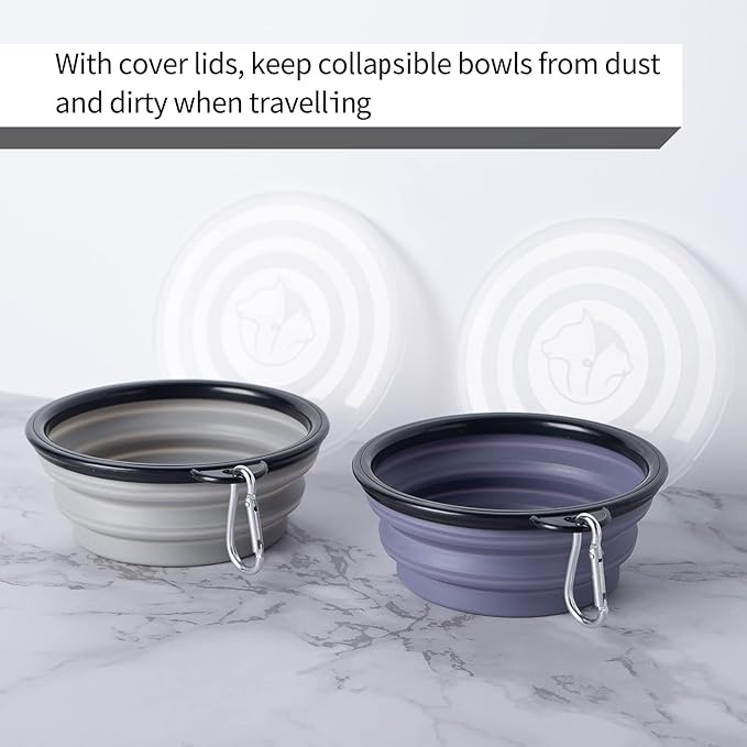 SLSON Dog Bowls Pet Collapsible Bowl with Cover Lids,2 Pack Dog Travel Bowls Portable Foldable Cat Water Dish Bowl for Pets Walking Parking Camping (Taro Purple and Concrete Gray, Small)