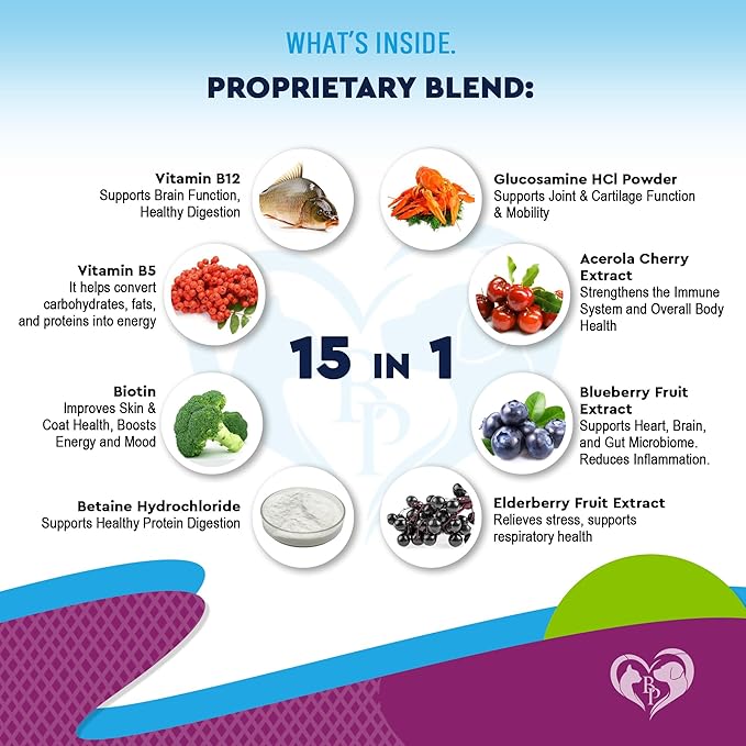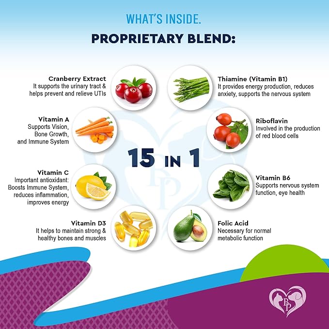 - ✅ 15-in-1 CATS & DOGS MULTIVITAMINS : It is a remarkable 15-in-1 multivitamin complex that offers comprehensive health support for your pets. Whether a puppy, an older dog, or a feline friend, this formula includes vitamins A, B1, B2, B6, B12, C, and D3, natural extracts, and more. It’s packed with antioxidants and essential animal vitamin sets that boost immunity, energy, and overall well-being. Can be used with food, treats, chews, powder, treat, bites.