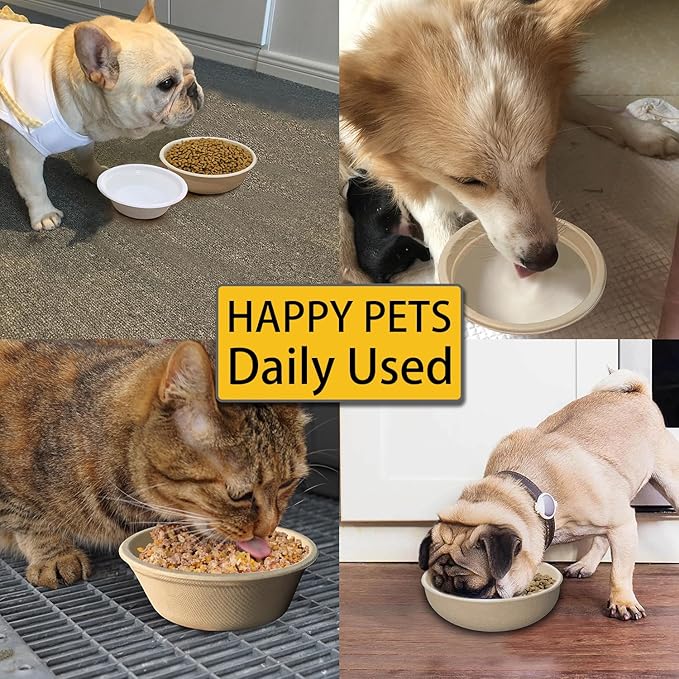 - DISPOSABLE DOG FEEDING BOWLS - Each package includes 50 pieces disposable dog bowls (Natural Color), the size of each disposable feeding bowls is 28oz, which can hold 3.5 cups of dog or cat food and water. These paper dog bowls are made of biodegradable and compostable bagasse fiber. They are recycled and tree-free to end deforestation. Even if these feeding bowls are disposable, you don't have to worry about their damage to the environment.