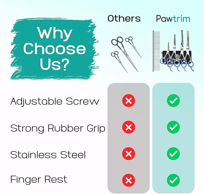 - What Your Pet Needs: Tired of Uncomfortable Pet Grooming Sessions? Try Our Adjustable Screw Scissors. Part of Pawtrim's comprehensive Dog grooming kit, these scissors offer the chance to customize your grip for maximum control and precision. Perfect to groom any pet easily and comfortably!