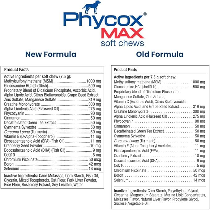 - Phycox soft chews dog supplement has gotten some updates and here is what you need to know: same active ingredients and dosage with new product appearance from updated inactive ingredients developed in consultation with a veterinary nutritionist.