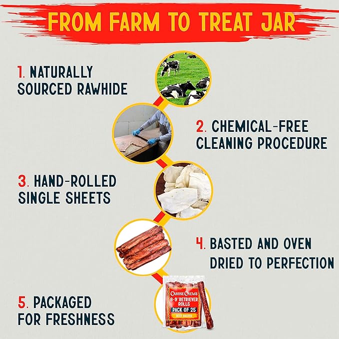 - Long Lasting Rawhide Dog Bones - Save your furniture with Canine Chews beef basted dog rawhide bones for large dogs. These long lasting retriever rolls rawhides will occupy your pup from helping to prevent their natural urge to chew valuables
