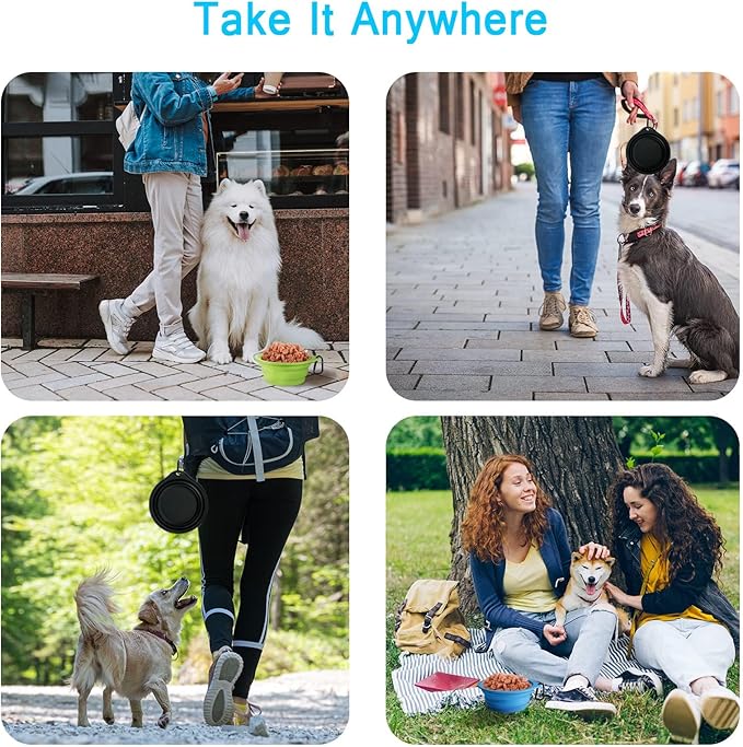 - Portable and Convenient: The collapsible dog water bowl are foldable, lightweight and compact, it's very handy when you are on a road trip, travel, dog park, hiking, camping, picnic, etc