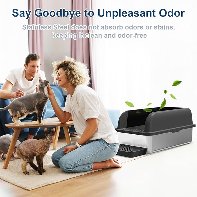 - Doesn't Absorb Odor: Cleaning the high walled stainless steel litter box for cats is very easy as waste slides off the smooth and nonstick surface effortlessly, leaving no lingering odors behind. Sturdy stainless steel won't get rust and scratches where odor can harbor like the plastic litter box doed, creating a clean and hygienic environment for your cats