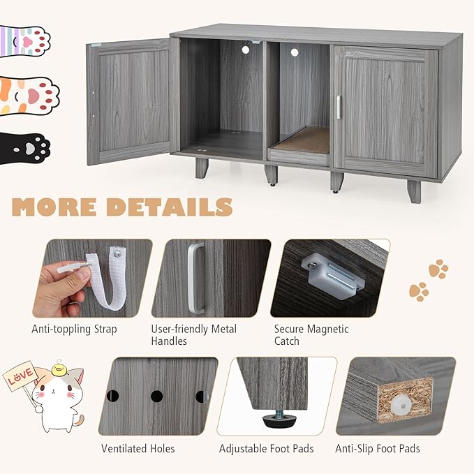 - 【3-in-1 Multipurpose Design:】This 2-door cat box cabinet can be used not only as a private cat washroom to hide the mess, but also as a cozy cat house or a TV stand in the living room. The spacious tabletop fits most flat screen TVs up to 50" and can place some daily necessities such as ornaments, books, table lamps, etc.