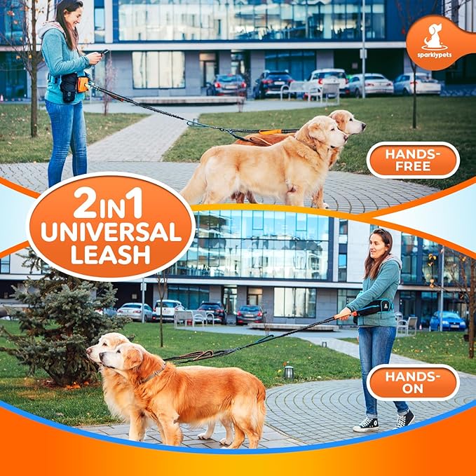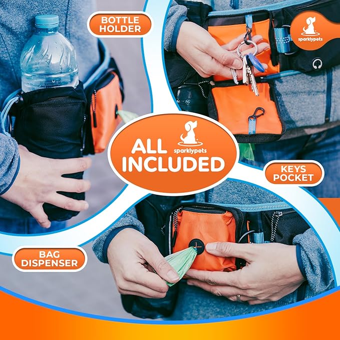 - All included on your dog walking belt – it’s easy with the all-in-one SparklyPets fanny pack for dog walking! With built-in essentials like a bottle carrier, bag dispenser, and key holder, the SparklyPets double leash for dogs will carry all your gear. Who needs a bulky backpack when you have everything you need right on your dog waist leash?