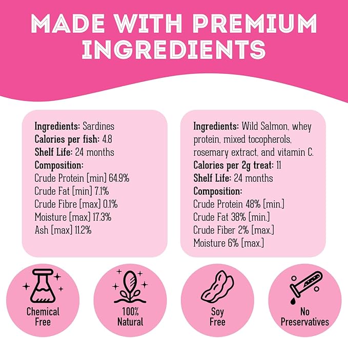 - NATURAL TREATS FOR DOGS & CATS WITH MAXIMUM NUTRIENT RETENTION - Our sardine treats and salmon treats are a 100% natural dog treat that’s slow-dehydrated, preserving vital nutrients, packed with vitamins and minerals, and healthy oils. These treats are high in protein, rich in omega 3 fatty acids, chemical-free, and have zero additives or preservatives. This makes them the ultimate choice for sardines for cats and sardines for dogs, promoting their health and vitality with natural, raw protein.