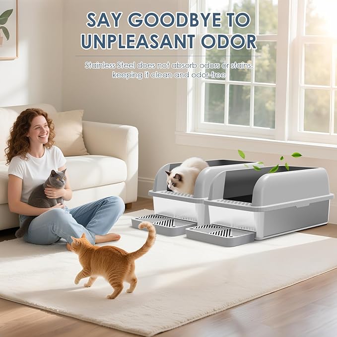 - Say Goodbye to Stinky Litter Boxes: Plastic litter box can trap odors no matter how much you clean, but our smooth litter box stainless steel surface allows waste to slide off easily without sticking. No absorbed smells, no stains, just quick and easy wiping to keep the box fresh. What's more, stainless steel won’t rust or scratch, which prevents odor buildup and provides a more hygienic environment for your cats
