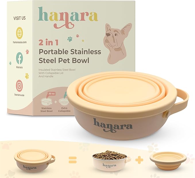 2-in-1 Insulated Dog Bowl with Collapsible Lid & Handle – Stainless Steel, Non-Slip Rubber Base – Portable Pet Water & Food Bowl for Dogs & Cats – 30 OZ + 20 OZ – Indoor & Outdoor (Beige)