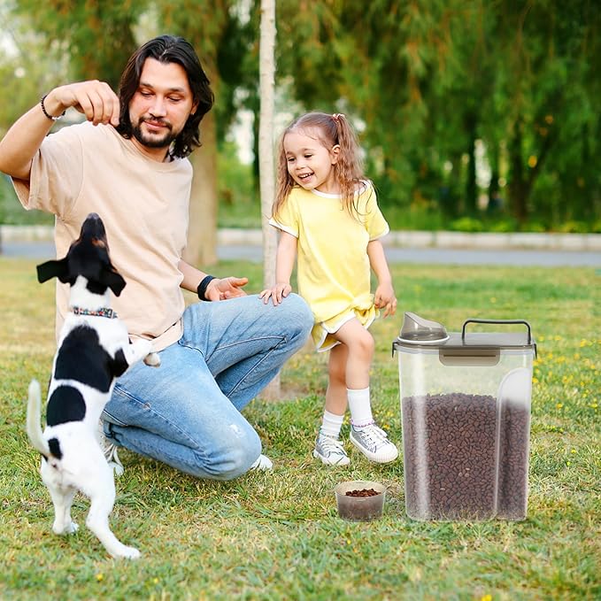 - WHAT YOU GET? The dog food storage container comes with a 1-pack airtight pet food storage container with a clear measuring cup and an upgraded large spout for easy pouring of pet food at any time. This dog food storage containers can be a gift The perfect gift for any home.