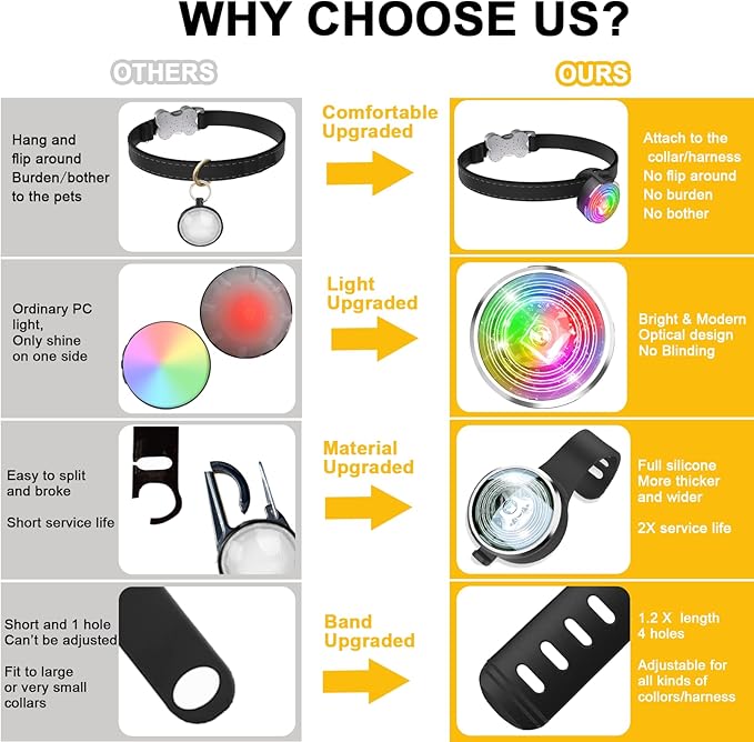 - 【Upgraded Silicone Band】 The thickness and length of the upgraded silicone band are 1.6 times that of the ordinary ones. The band is more hard and durable, not easy to break, adjustable. The collar light for dogs at night is suitable for all kinds of dog/cat collars small to large.