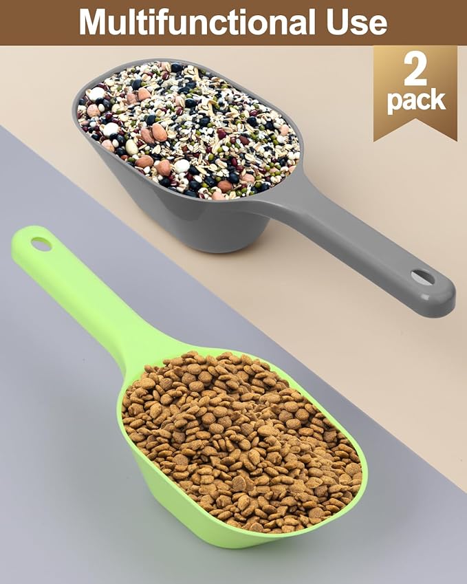 • Pack of 2 Measuring Scoops – Comes in a package of 2 different colored dog food scoop. (Green and Grey)
