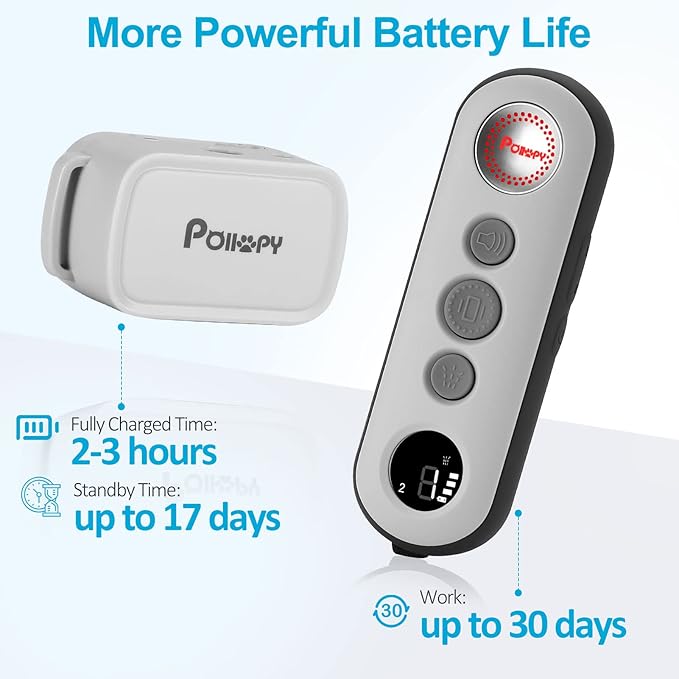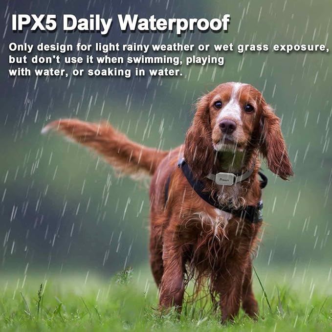 - 【Long-Lasting Battery & IPX5 Waterproof】: Built-in a rechargeable lithium-ion battery, fully charged in 2-3 hours and last up to 12 days for the collar and 30 days for the remote. 【NOTE】: IPX5 waterproof design only for light rainy weather or wet grass exposure, but don't use it when heavy raining, swimming, playing with water,or soak in water