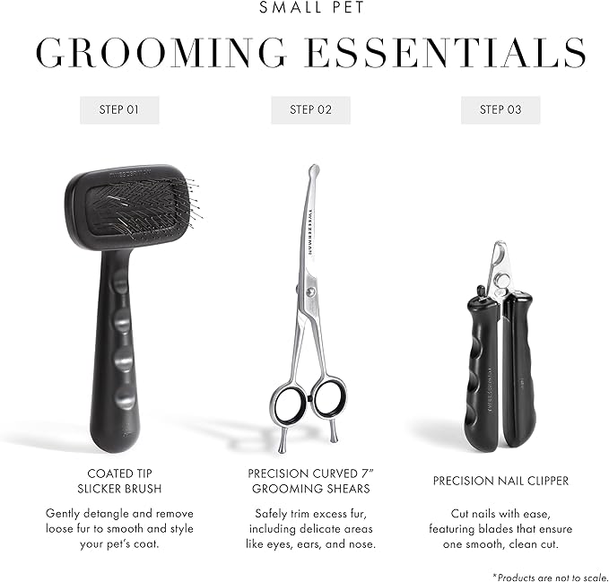 - To use these cat and dog shears for grooming, brush coat, ensuring its clean and free of any knots. Hold shears with thumb in bottom finger loop and ring finger in top finger loop, resting your little finger on the finger rest. Using the full blade trim in small sections for desired length and shape.