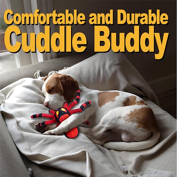 - Funny Dog Chew Toy: Cute angry spider,Vibrant red dog toys. This super fun large dog toy has a squeaker in the head and crinkly paper in legs. Squeak and crinkle offer a delightfully sounds treat. The highly elastic tentacles offers maximum tug of war pleasure, while the sound attraction and dynamic changes will keep your pet engaged for hours. The squeaky dog toy is the ultimate toy for your furry friend and no dog can resist it