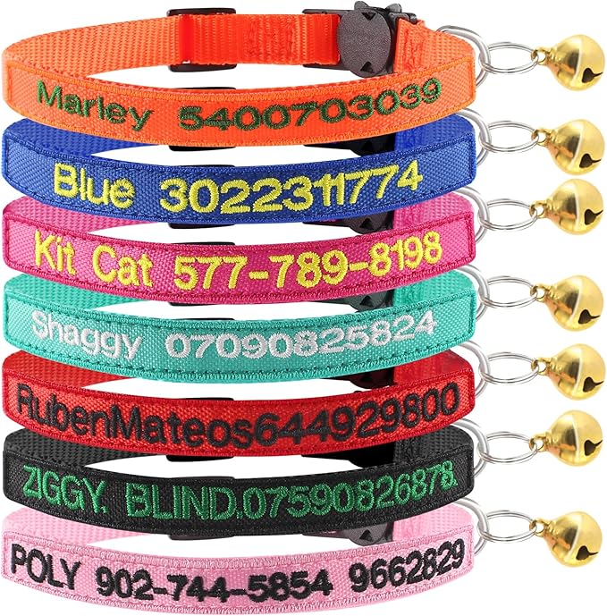 - 【 Custom Collar for Cats】- NEW & IMPROVED 7-PACK -SETS - You get a 7-pack of our newest embroidery cat name and phone number set with 7 different colors (red, blue, orange, Teal, black, pink ,rose) ,4 Embroidery Thread color options (black ,green ,yellow ,white)