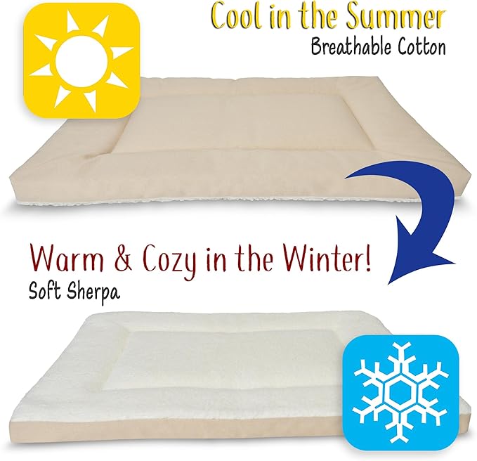 - 𝐒𝐭𝐲𝐥𝐢𝐬𝐡 𝐂𝐨𝐥𝐨𝐫𝐬 & 𝐅𝐚𝐛𝐫𝐢𝐜: Available in Plush fabrics, our Soft Crate Pads come in designer colors that will look great in your home. Choose from a Cream, Blue, or Pink Dog Bed that feels so luxurious you´ll want to sleep on it! Our Denim or Tan Dog Crate Mat is the Only (Truly) Cotton Dog Bed on Amazon. With a reversible Sherpa side for cold weather and Cotton for warm summers, this is the perfect all season Crate Pad!