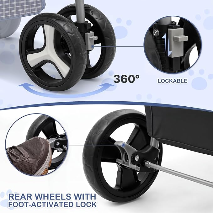 - Superior Wheel Design for Smooth Rides - Navigate with ease thanks to our pet stroller's robust wheel system. It boasts a 6-inch front wheel diameter for agile maneuvering and a 7-inch rear wheel diameter for stability, complete with reliable rear wheel brakes for safe strolling.
