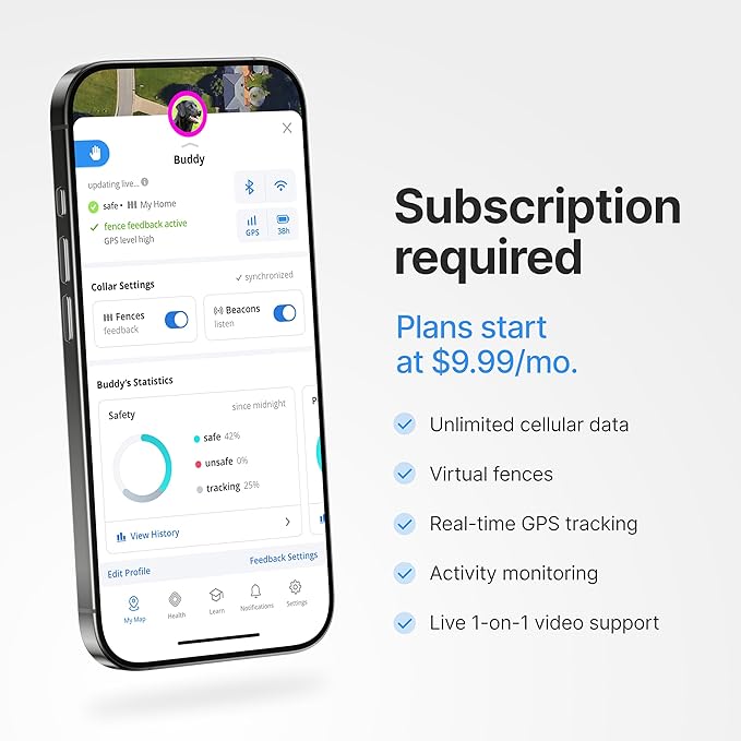 - SUBSCRIPTION REQUIRED: Your collar needs GPS services and cellular data to create, edit, and use the wireless dog fences and GPS tracking. Pack Membership Plans start at $9.99 per month. Select a plan after purchase