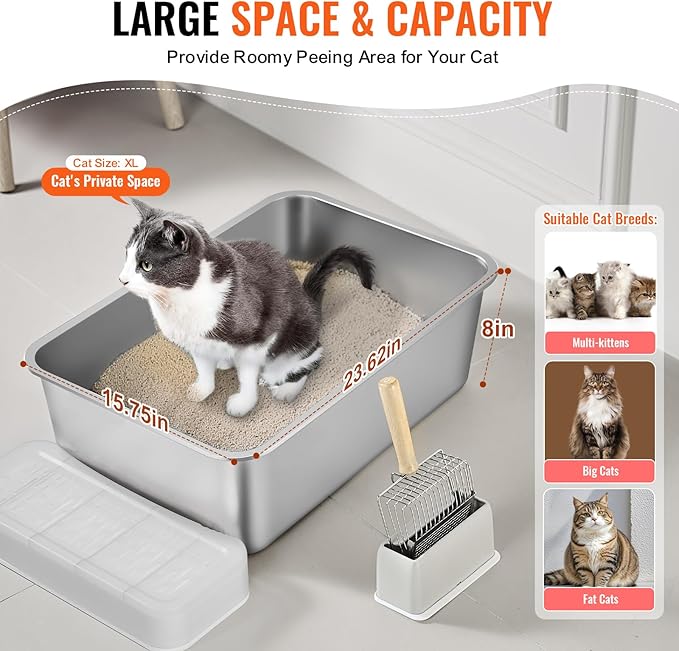 - 23.6-Inch Litter Box: Designed for larger cats, this spacious stainless steel cat litter box allows easy turning and movement, accommodating up to 48 liters of litter. Suitable for ensuring your big cat has plenty of room to stay comfortable and clean, lowering the need for frequent refills.