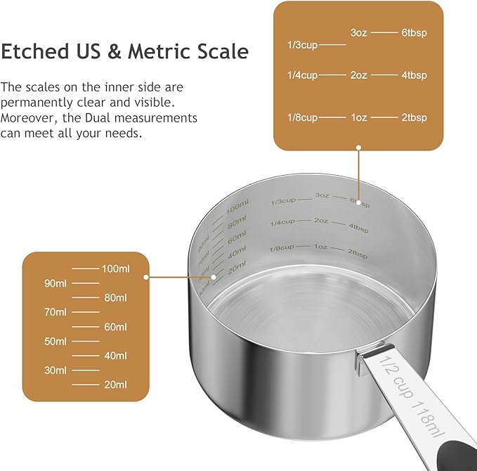 - Precise Measurement: There are multiple etched marking on the interior surface(1oz, 2oz, 3oz, 100ml, 90ml, 80ml, 70ml, 60ml, 50ml, 40ml, 30ml, 20ml) and engraved marking on the handle(1/2cup, 118ml), so you don’t need guess the amount of food. Each line corresponds to a specific volume, allowing you to fine-tune your pet's diet to meet their individual needs, ensuring your furry friend gets the optimal nourishment for a healthy and active life